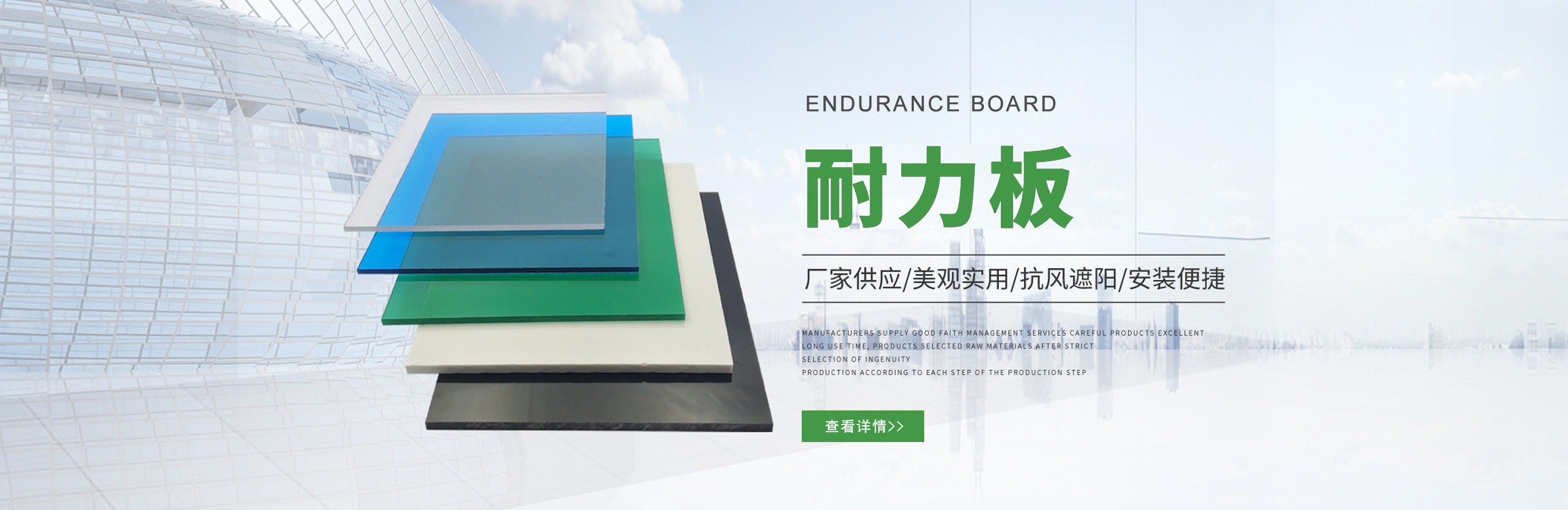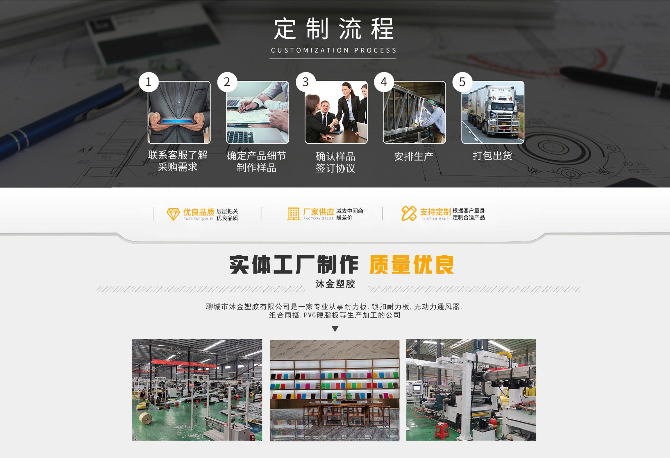 聊城市沐金塑膠有限公司注冊資金2180萬元,占地20000余平方,擁有自建廠房15000平方,員工100余名。10余年來,公司主營耐力板,鎖扣耐力板,耐力板深加工,無動力通風器,組合雨搭,PVC硬脂板,耐力板廠家等板材的發展戰略,逐漸成長為綜合性企業。 公司擁有多條板材共擠生產線,采用世界知名品牌進口原材料和先進工藝,依據完善的ISO9001質量管理體系和ISO14001環境管理體系,為產品的卓越品質提供了強有力的保證。憑借過硬的創新能力和堅實的硬件基礎,贏創已成為國內領先的熱塑性板材生產商,產品被廣泛應用于建筑業、農業、工業、廣告業、安防行業及DIY領域?! 」臼冀K致力于通過提供最優的板材應用解決方案,為客戶創造最高的價值;堅守創新、質量、靈活、服務和速度的核心價值觀;堅持“完美的產品需要完美服務的支持”的經營理念,努力實現成為世界領先的板材與解決方案供應商的夢想?! ≡谖磥恚緦⒘⒆憧蛻粜枨螅粩喔淖兒屯晟片F有產品,拓展產品線和充分開發板材的應用領域,為客戶創造全方位的價值。同時更好地實現員工的價值,實現公司團隊的價值。我們將與您一起創贏未來! 企業使命:成為世界領先的板材與解決方案供應商?! 」驹妇埃和ㄟ^提供最優的板材應用解決方案,為客戶創造最高的價值。 核心價值觀:質量...